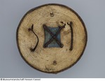 Mittelplatte aus Holz, Ruten in 17 Windungen, umflochten mit ungefärbter Baumwolle, am Rand des Schildes Ledereinfassung.