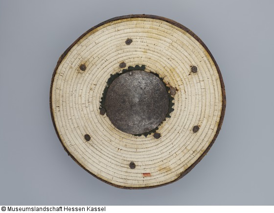 Runder, flach gewölbter Schild aus vermutlich Weidenruten, die in 17 Windungen (um die letzte Windung ist eine Einfassung aus Leder gelegt) um eine Mittelscheibe aus Holz gelegt sind und mit ungefärbter, feiner Baumwollfaser umwickelt/umflochten ist.
