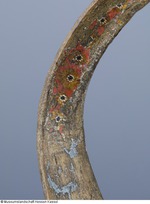 Bogen aus einem Stück Holz gefertigt (Theaterbogen?). Reste von Bemalung in Blau, Rot und Gold. (05.11.12 AB) |