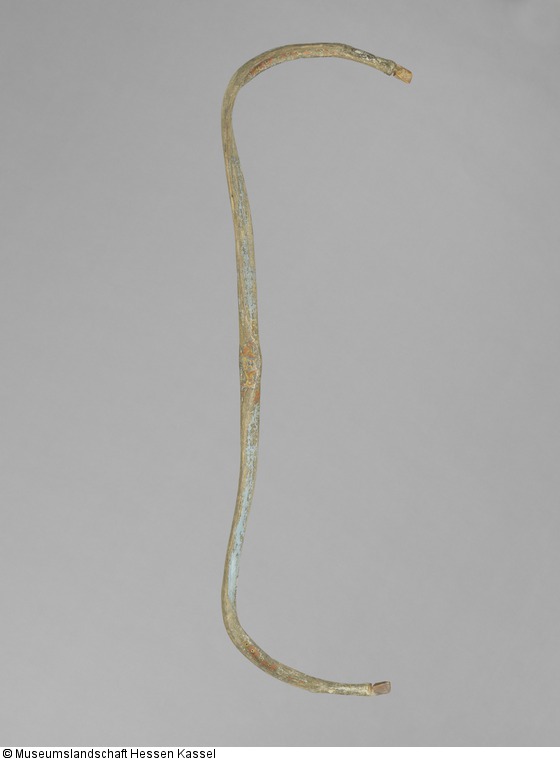 Dieses Stück sieht wie ein Reflexbogen im ungespannten Zustand aus. Bei genauerer Betrachtung ist allerdings erkennbar, dass er lediglich aus einem einzigen Stück Holz geschnitzt wurde. Hier ist ein osmanischer Bogen nachgeahmt worden, der bei Hoffesten zum Einsatz gekommen sein mag. Der heimische Hersteller kannte aber nur die landgräflichen Bögen ohne Sehnenbespannung. Dieses Stück ist vermutlich der im Inventar des Armaturenzimmers von 1780 erwähnte hölzerne