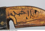 Reflexbogen, die Komponenten aus Holz, Horn und Sehnen und dunklem Leder sind miteinander verleimt. Die Bogenarme sind mit schwarzer Grundfarbe versehen und mit Medaillons in Gold und Rot, die Griffe und Grate mit roter Bemalung und goldenen Zickzacklinien verziert. An den Bogenohren sind Signatur und Jahreszahl gut erkennbar. (07.11.12 AB) |