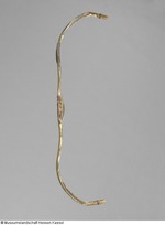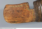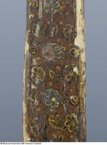 Reflexbogen, die Komponenten Holz, Horn, Sehnen und Leder sind miteinander verleimt. Das Leder ist farbig bemalt. Griff und Grate mit roter Farbe und goldenem Rankenmuster, die Bogenarme mit orangebrauner Grundfarbe mit goldgrünem Blumendekor. Schwer lesbare Meistersignatur und Jahreszahl an den Bogenohren. Ein Wurfarm des Bogens ist angebrochen und wurde mit zwei Eisenplatten repariert. Wann diese Maßnahme vorgenommen wurde, ist nicht bekannt. (07.11.12 AB) |
