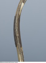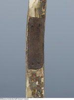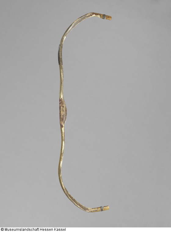 Dieser Bogen weist an einem der Arme eine Bruchstelle auf. Wann die Beschädigung entstand, ist nicht bekannt. Die Reparatur erfolgte sicherlich erst nach Eingang in die fürstliche Sammlung, da allein der Schaden den Bogen für den Kriegseinsatz untauglich machte. (15.10.12 MZ)