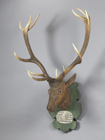 Holz (Grundplatte: Eiche, Kopf: Linde),Geweih, Haut- und Haarreste, Fassung, Metall |