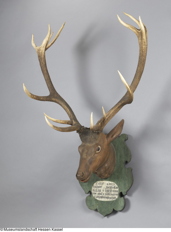 Laut eines zeitgenössischen Inventars aus kurfürstlicher Zeit schmückte diese Trophäe eines am 21. September 1684 im Reinhardswald durch Landgraf Carl von Hessen-Kassel (1654-1730) erlegten 14-Enders zusammen mit zwölf weiteren Trophäen die kurfürstliche Gewehrkammer zu Kassel.