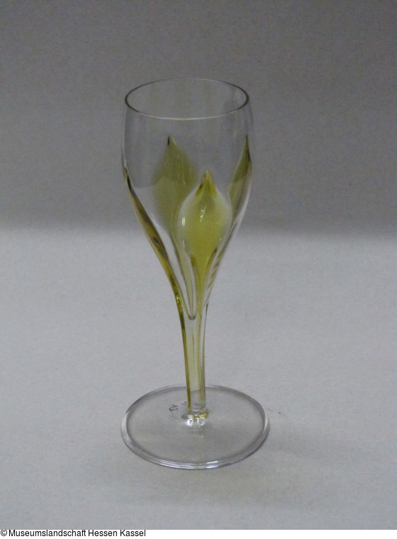 Aus einem neunzehnteiligen Tafelservice mit zwei Karaffen; siehe dazu die "Preisliste der Rheinischen Glashütten 1903": Tafel-Service Excelsior mit eingeschmolzenen gelben und grünen Blättern" (Hilschenz 1973, Kat. Nr. 3)