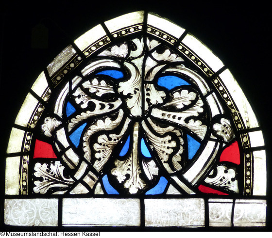 Die beiden Scheiben (KP G 744, 745) mit Ranken und Blattpalmetten dürften einst zum Bestand des Museums Fridericianums gehört haben und 1913 in das neu errichtete Hessische Landesmuseum gelangt sein. Möglicherweise wurden sie von den Kurfürsten Wilhelm I. oder Wilhelm II. für die Kapelle der Löwenburg erworben.