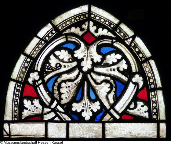 Die beiden Scheiben (KP G 744, 745) mit Ranken und Blattpalmetten dürften einst zum Bestand des Museums Fridericianums gehört haben und 1913 in das neu errichtete Hessische Landesmuseum gelangt sein. Möglicherweise wurden sie von den Kurfürsten Wilhelm I. oder Wilhelm II. für die Kapelle der Löwenburg erworben.