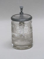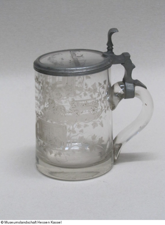 Der Bierseidel gehört zu der großen Gruppe der Souvenirgläser, die dem Gedächtnis besondere Orte oder Ereignisse bewahren sollten. Die Inschrift teilt den Anlaß mit: "Heinr. Langenfeld/ von/ seinen Reise-Collegen. – Zur Erinnerung/ an die/ Coburger Reise/ vom 21. b. z. 24. Juli 1860".