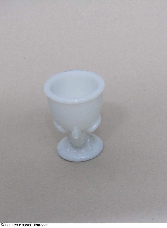 Eierbecher aus gepreßtem Beinglas: ein Hahn hält zwischen den Flügeln den Becher hoch