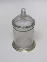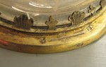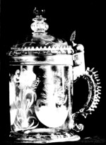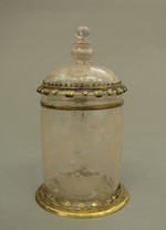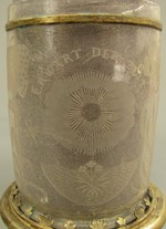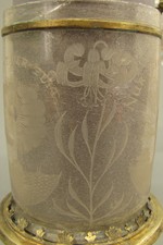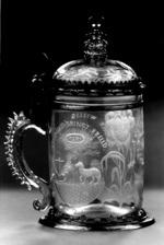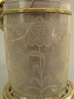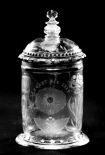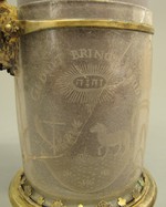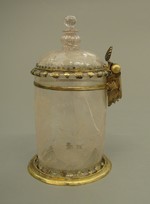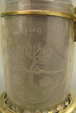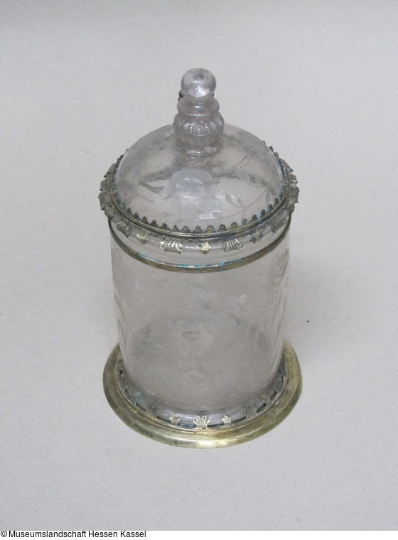 "Eins [gemeint ist: ein Glas wie ein Krug geschnitten] etwas kleiner mit einem gläsern Deckell und mit Silber eingefaßt und vergült."