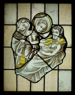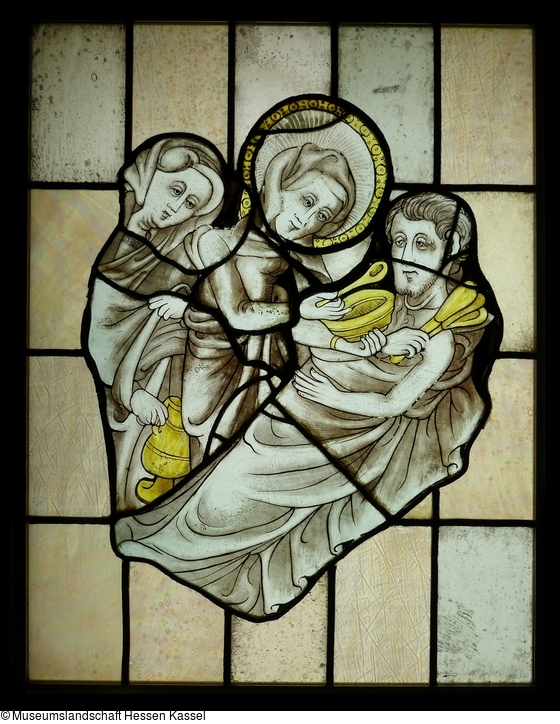 Elisabeth von Thüringen (1207-1231) ist die bekannteste Heilige Hessens. Als Großmutter des ersten Landgrafen und als Heilige, die seit 1235 in Marburg verehrt wurde, galt sie als Patronin des Landes Hessen. Zu Lebzeiten verschrieb sie sich dem neuen Frömmigkeitsideal der Armut und Nächstenliebe und gründete ein Hospital, in dem sie selbst Bedürftige pflegte. Die Szene des Glasfensters veranschaulicht, wie Elisabeth in Begleitung einer Magd einen Kranken füttert. Eine vergleichbare Darstellung findet sich in einem der Chorfenster der Elisabethkirche in Marburg.