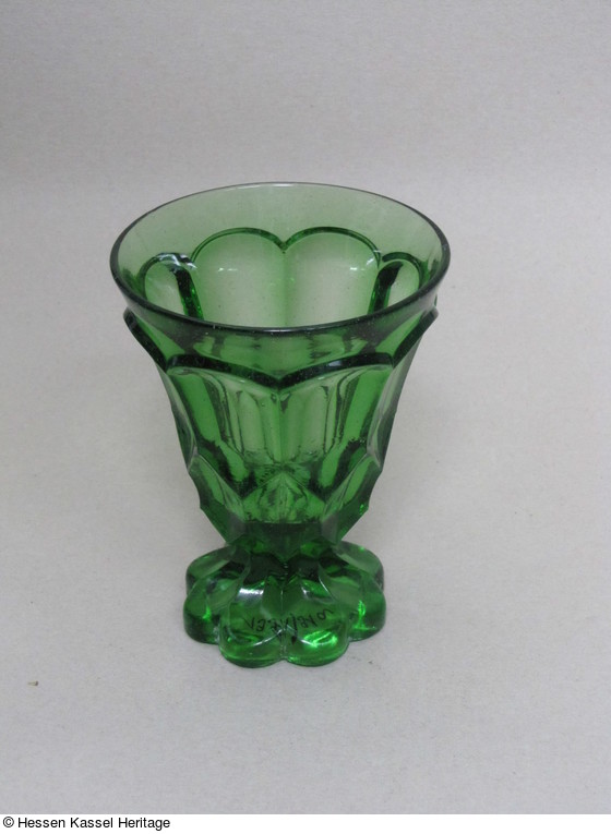 Preßglas, dunkelgrün, aus vierteiliger Form, stempelgepreßt. |