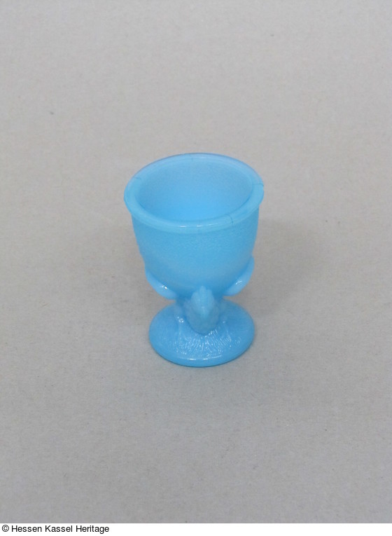 Eierbecher aus gepreßtem Beinglas: ein Hahn hält zwischen den Flügeln den Becher hoch