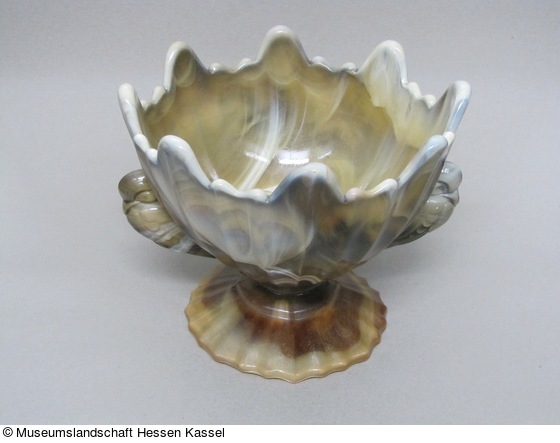 Grau, weiß, gelb und braun marmoriertes opakes Preßglas, das aus Glasresten, sog. Glasschlacke (engl.slag) zusammengeschmolzen wurde. Aus vierteiliger Form gefertigt, die Nähte sind sichtbar. |