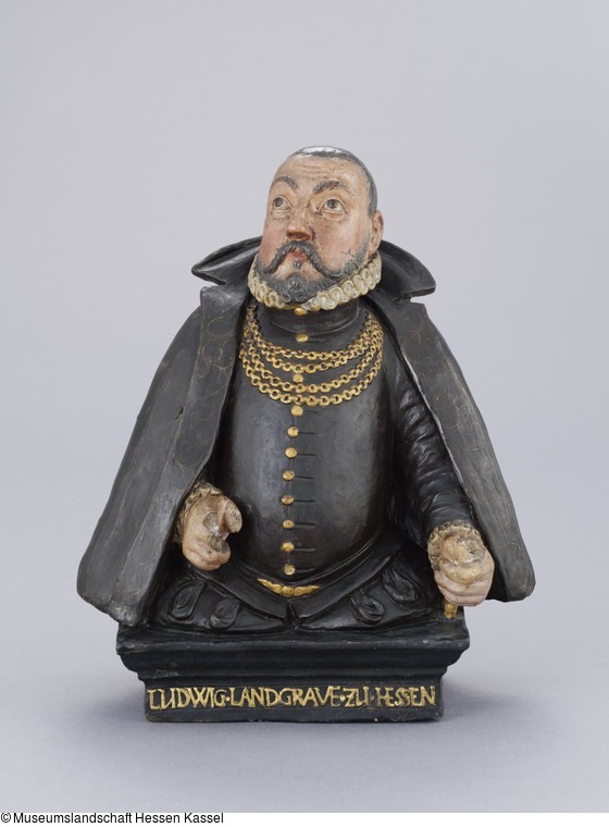 Der Güldene Saal im 1811 durch Feuer zerstörten Kasseler Landgrafenschloss diente als Tanz- und Festsaal. Mehr als hundert Porträts europäischer Fürsten und Adeliger zierten seine Fensternischen. Die Landgrafenfamilie war in lebensgroßen Büsten zugegen. Beim Schlossbrand ging der Güldene Saal verloren. Erhalten habe sich aber Kleinversionen der Fürstenporträts sowie bemalte Tonrepliken der Landgrafenbüsten, so diese Porträtbüste von Ludwig IV. von Hessen-Marburg (1537-1604). (Vgl. auch KP B XVIIb.32,1-4 und 6-10)