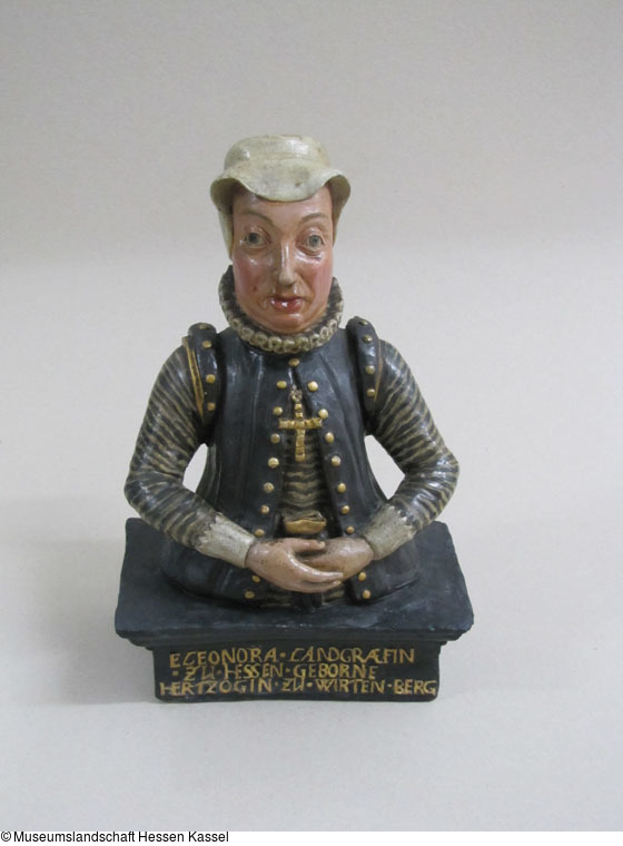 Der Güldene Saal im 1811 durch Feuer zerstörten Kasseler Landgrafenschloss diente als Tanz- und Festsaal. Mehr als hundert Porträts europäischer Fürsten und Adeliger zierten seine Fensternischen. Die Landgrafenfamilie war in lebensgroßen Büsten zugegen. Beim Schlossbrand ging der Güldene Saal verloren. Erhalten habe sich aber Kleinversionen der Fürstenporträts sowie bemalte Tonrepliken der Landgrafenbüsten, so diese Porträtbüste von Eleonora, geb. Herzogin von Württemberg, zweite Gemahlin von Landgraf Georg I. von Hessen-Darmstadt (1589-1618). (Vgl. auch KP B XVIIb.32,1-9)