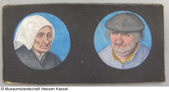 Brustbilder eines alten Mannes mit Kappe und einer alten Frau mit weißem Tuch |