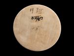 Elfenbein, gedrechselt, geschnitzt, geschabt und poliert. Auf der Rückseite konzentrische Drechselspuren am Rand, starke, parallel geführte Schraffuren. |