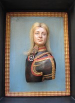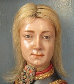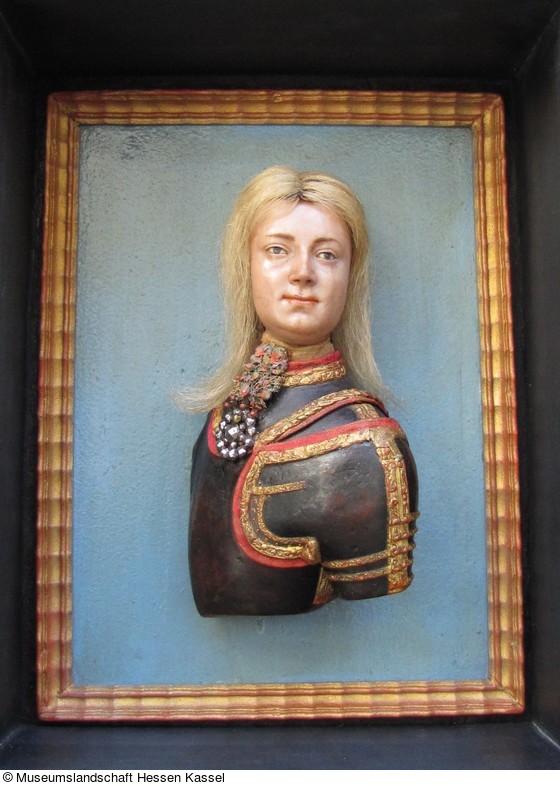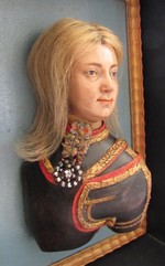 Holz, gefasst, Rahmen vergoldet, Wachs, Metall, Textil, Haar |