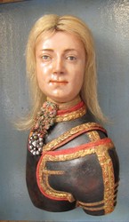 Wachsporträtbüste eines Mannes auf Holzplatte |