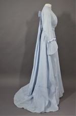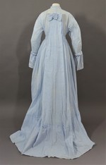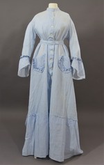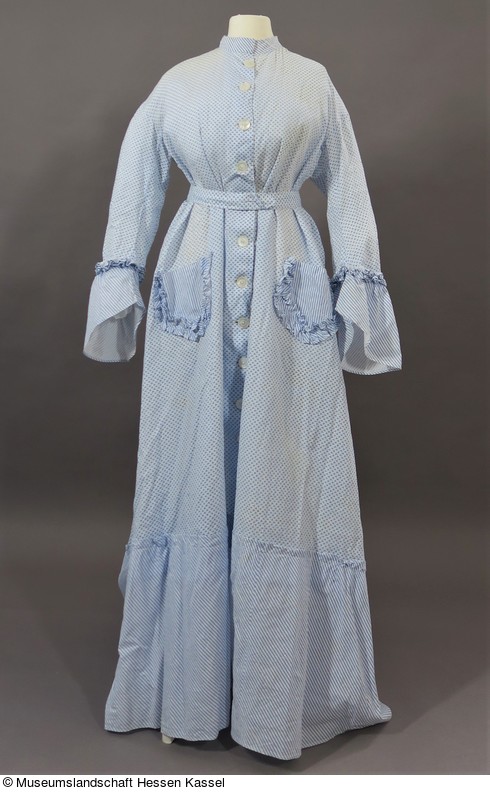 Das Hauskleid aus weißem, mit blauen Blüten bedrucktem Kattun hat einen Stehkragen und lange Ärmel. Im Rücken ist eine angeschnittene Watteaufalte aufgesetzt, die in einer Schleppe endet. Es wird vorne vom Hals bis zur Saumgarnierung mit 13 großen Perlmuttknöpfen geschlossen.