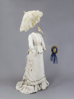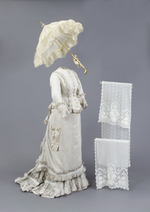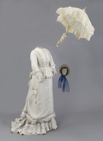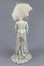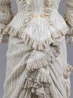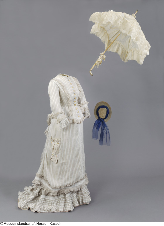 Oberteil, Rock und Überrock; Taille, lange Ärmel, hochgeschlossen, Rüschen und Spitze, Knopfverschluß vorne; Rock hinten gereiht, vorne glatt, Volants am Saum; Überrock hinten offen, aufgesetzte Taschen, Rüschen und Spitze