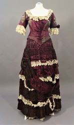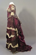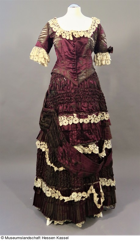 Das zweiteilige Gesellschaftskleid ist aus bordeauxrotem Halbseidenatlas und reich mit Blondenspitze (Seide) garniert.