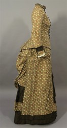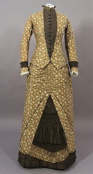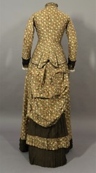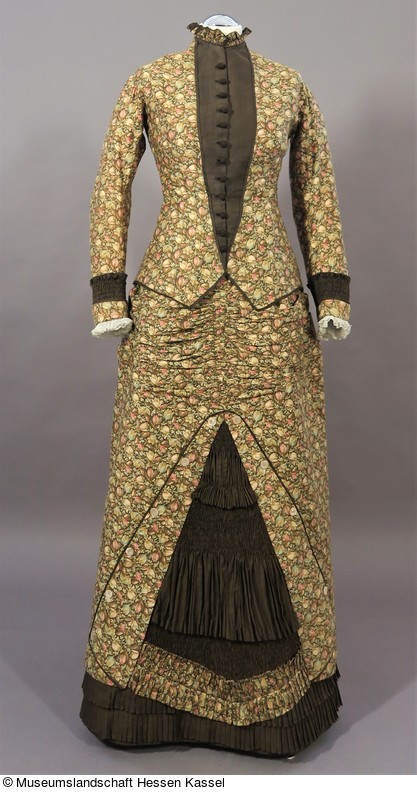 Das Haus- oder Promenadenkleid besteht aus dunkelbraunem, mit hellen Blumen bedrucktem Baumwollsatin und einem gleichfarbigen, uni Garniturstoff. Es hat einen Rüschenkragen, lange Ärmel und eine Tournüre.