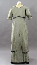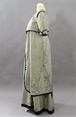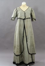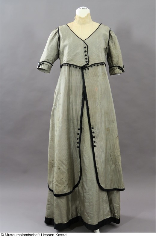 Das Kleid hat einen Spitzeneinsatz mit sehr hohem, durch Kragenstäbchen versteiften Kragen. Dieser Einsatz ist in ein Unterkleid aus weißem Baumwollbatist eingesetzt, an dem etwa in Kniehöhe der quergestreift verarbeitete Kleiderrock angenäht ist. Die vordere Bahn reicht bis in Taillenhöhe hinauf. Darüber setzt in Brusthöhe der längsgestreift verarbeitete Überrock an. Er ist ca. 25 cm kürzer als der untere Kleiderrock, wird vorne übereinander geschlagen und der Überschlag oben mit Druckknöpfen sowie Haken und Öse geschlossen. Etwa in Kniehöhe sind die Vorderkanten mit jeweils 5 kleinen, mit schwarzer Seide besponnenen Kugelknöpfen besetzt. Im Rücken ist eine schmale, gerade Bahn aufgesetzt, die bis an den Saumbesatz des Kleiderrockes reicht. Auf den Seiten sind über dem Saum des Überrockes jeweils 6 weitere der Kugelknöpfe aufgesetzt.