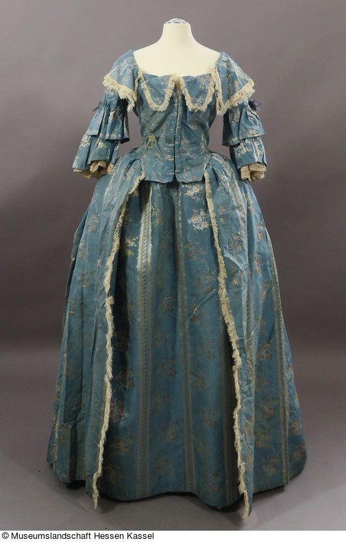 Im 18. Jahrhundert bestand die Damenkleidung aus einem Rock, der über einem anfangs runden, ab 1750 ovalen Reifrock fiel und einem Überkleid, dessen Rock von der Taille aus offen zur Seite fiel. Ab etwa 1750 unterschied man dabei zwischen der formellen, aufwändigeren Robe à la française und der schlichteren Robe à l’anglaise.