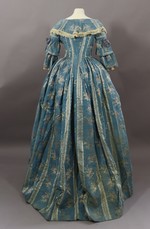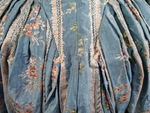Nur einzelne Details deuten auf die ursprüngliche Form dieser Robe à l’anglaise hin. Das Mieder ist auf Leinen gearbeitet und Alle Teilungsnähte des Mieders sind mit Fischbeinstäben versteift. Der Rocksaum ist mit gechinztem Leinen abgefüttert und 2 weiße Fadenbüschel, die im Rücken rechts und links neben der Miederspitze vorhanden sind, deuten darauf hin, dass hier ursprünglich 2 Knöpfe angenäht waren, an den man Schlaufenbefestigen konnte, um den Rock des Überkleides hochzuraffen zur Robe à la polonnaise.