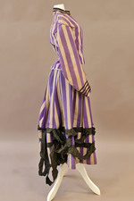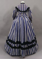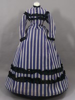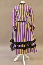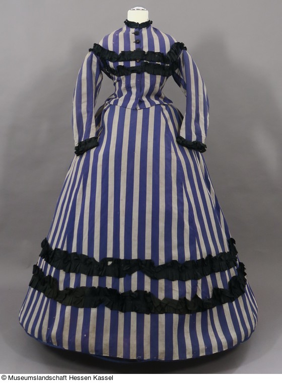 Das Ensemble besteht aus 2 Jacken und 2 Röcken aus lavendelblau und weiß gestreiftem Leinen. Da Garnitur und Schattierung des Blautons nur bei jeweils einer Jacke und einem Rock übereinstimmen handelt es sich um 2 komplette Kleider. Die unterschiedlichen Maße, vor allem die der Rocklängen, zeigen, dass es sich um ein Kleid für eine erwachsene Frau und um ein Kleid für ein Mädchen von ca. 12-14 Jahren handelt, da der zweite Rock nur bis etwa über die Knie reicht. Das erste lange, "erwachsene" Kleid bekamen Mädchen damals üblicherweise zur Konfirmation, also mit 14 oder 15 Jahren.