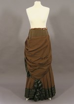 Tournürenrock aus dunkelbraunem Wollköper mit Garnierungen aus dunkelgrüner, in sich gestreifter Seide und dunkelgrünen Atlasschleifen.