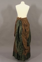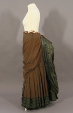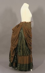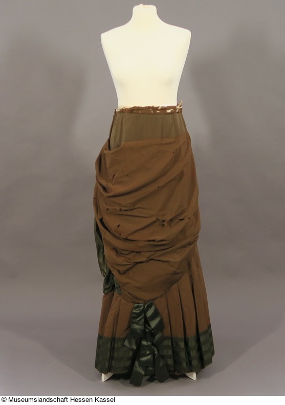 Der eigentliche Rock ist gerade geschnitten und leicht ausgestellt, am Saum ist ein schmaler Volant mit einer schmal gefälteten Saumrüsche aus dunkelgrünem Baumwollsatin angesetzt. Darüber liegt der auf der Hüfte auf den unteren Rock genähte Tournürenrock, der aus einem nach hinten schräg ansteigenden Faltenteil und dem vorderen, in Wasserfallfalten arrangierten Schürzenteil besteht. Daran schließen an den Seiten zwei Drapierungen aus der grünen Seide an und in der rückwärtigen Mitte das zentrale Stück der Tournüre aus braunem Wollstoff. Der Faltenteil ist am Saum mit einem 14 cm breiten Streifen der grünen Seide besetzt. Der Schürzenteil und die rechte Seite der Tournüre sind außerdem mit Schlaufen aus dunkelgrünem Atlasband garniert.