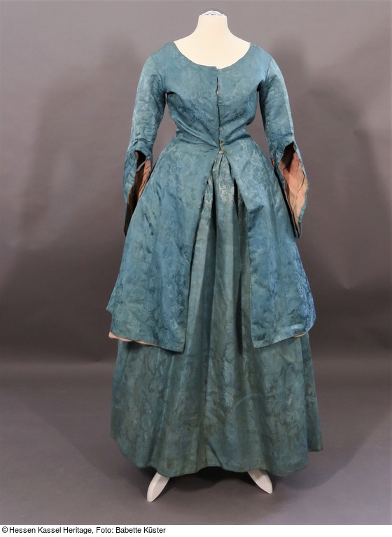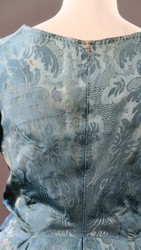 Beide Jacken sind aus einem hellblauen Seidendamast mit einem sehr ähnlichen, naturalistischen Blumendekor gearbeitet. Unterschiedlich farbige Webkanten beweisen jedoch, dass die beiden Seiden mindestens von 2 verschiedenen Herstellern stammen. Seidenstil und Kleiderschnitt stammen aus der Zeit von 1740 bis 1750.