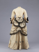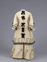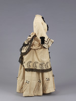 Oberteil, Rock, Überrock, Schößchen; Oberteil: Pagodenärmel, Stehkragen, Knopfverschluß, schwarze Schleifen und Spitze; Rock: aufgesetzte Schleifen und Rüschen; Überrock am Gesäß gerafft, schwarze Schleifen, Spitze, Paisleymuster; Schößchen an Taillenband.