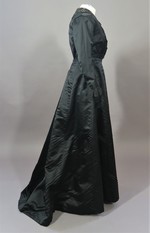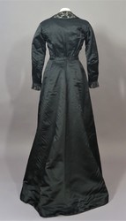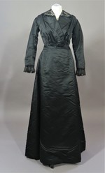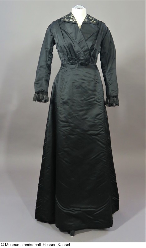 Das 2-teilige Damenkleid aus schwarzem Satin besteht aus einer langärmeligen Jacke mit Reverskragen und einem Rock mit kurzer Schleppe.