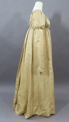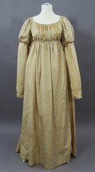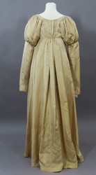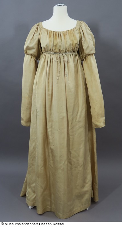 Das Empirekleid aus ehemals goldgelbem Seidenköper hat einen eckigen Ausschnitt und überlange, am Oberarm gebauschte Ärmel.