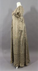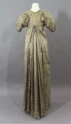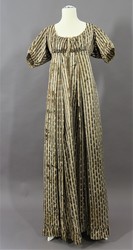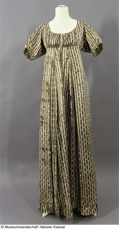 Das Chemisenkleid aus längsgestreiftem Satin (Atlas liseré) ist bodenlang, hat einen runden, tiefen Ausschnitt, kurze, gebauschte Ärmel und wird vorne mit Zugbändern am Ausschnitt und unter der Brust geschlossen.
