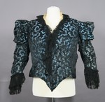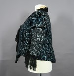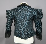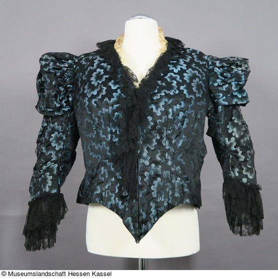 Die Jacke ist kragenlos und hat einen spitzen Ausschnitt, der innen mit mehreren Lagen weißer Spitze besetzt ist. Sie wird vorne mit Haken und Ösen geschlossen und endet in einer spitzen aber kurzen Schneppe. Die Ärmel sind 3/4 lang und an der Schulternaht stark angekraust. Unter der Armkugel ist eine tiefe Falte eingelegt um den darüber liegenden Bausch zu stützen.