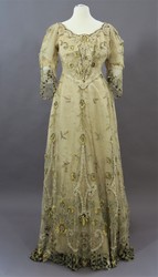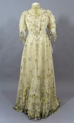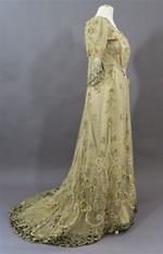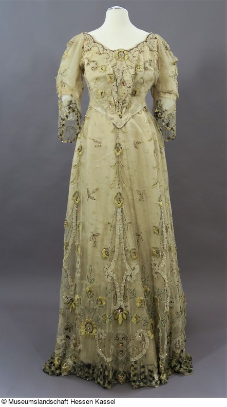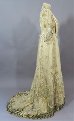 Es besteht aus hellem Tüll, der mit Perlen, Pailletten und Seidenfäden mit einem Dekor aus Blumenranken bestickt und mit gerüschten Spitzenbändern garniert ist. Der Tüll ist mit einer cremefarbenen Seide unterlegt.
