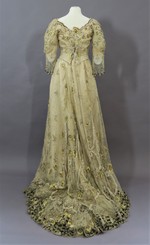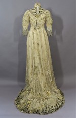 Das 3-teilige Ensemble aus Rock mit Schleppe, ausgeschnittenem Mieder und Stehkrageneinsatz konnte entweder hochgeschlossen als Gesellschafts-, oder mit tiefem Ausschnitt als Ballkleid getragen werden.