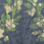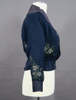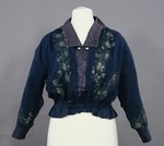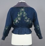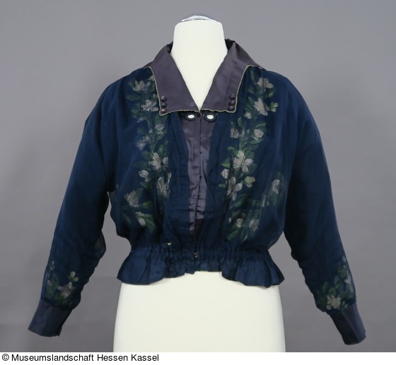 Die Jacke besteht aus dunkelblauem, leichten Seidentaft, auf den im Rücken, den Seitenteilen und unten an den Ärmeln Ranken aus weißen Blüten, Knospen und Blättern in Plattstichstickerei appliziert wurden. In der Taille ist ein Tunnelzug eingearbeitet und die Weite der Jacke ist eingehalten, so dass darunter ein kleiner Schoß entsteht. Die vorderen Verschlusskanten, die Ärmelbündchen und der langgezogene Kragen bestehen aus violettem Seidenatlas. Der Kragen ist außerdem mit einer Bise aus hellgrüner Seide eingefasst und an den unteren Ecken mit 3 halbkugeligen Knöpfen besetzt, die mit violetter Seide übersponnen sind.