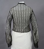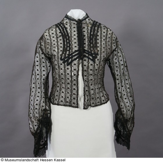 Die am Hals anliegende Bluse wird in der oberen Hälfte mit Haken und Ösen geschlossen. Der Halsausschnitt und die Hakenleiste sind mit verstärktem schwarzen Atlasband besetzt und mit schwarzer Klöppelspitze eingefasst. Auf den Vorderteilen der Bluse sind die gleichen Atlasbänder in 3 Reihen in Form eines langezogenen Reverskragens aufgesetzt.