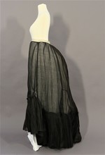 Unten ist ein 35 cm breiter Volant angesetzt, der in schmale Falten gelgt ist. Er endet 2 cm über dem Saum, der mit einer zweiten Lage des Batistes unterlegt und mit schwarzer Wolltresse eingefasst ist.