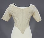 Taillenkurzes Damenmieder aus cremefarbener Taftseide mit langer, spitzer Schneppe und kurzen Ärmeln. Der breite, vorne v-förmig geschwungene Ausschnitt ist undekoriert.