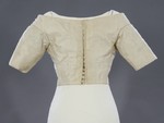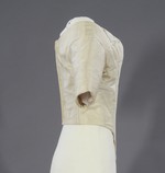 Bis auf die Seiten sind in allen Nähten und Kanten Biesen mitgefasst. Die Seide ist auf ein Leinenfutter gearbeitet und vorne im Bereich zwischen Schulter und Brust und an der vorderen Ausschnittkante leicht gepolstert. An den Formnähten sind Fischbeinstäbe eingearbeitet.