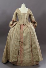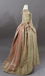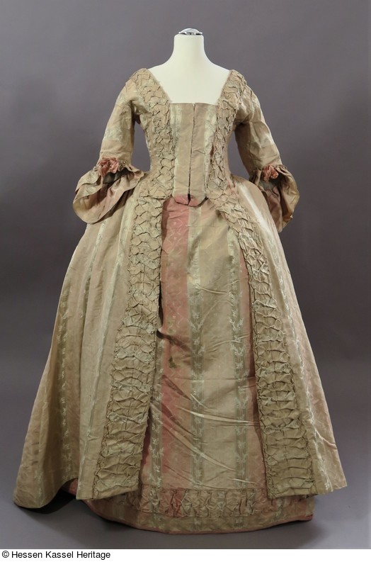 Dieses Kleid ist eine Leihgabe des Staatstheaters, wo es stark verändert wurde. Die falten des Kleiderrockes wurden aufgetrennt, anders angeordnet und wieder festgenäht. Ähnlich verfuhr man auch mit dem Überkleid. Die Watteaufalte im Rücken wurde an den Seiten zugenäht, oben am hinteren Halsausschnitt aber aufgetrennt. Das Miederteil wurde durch innen eingesetzte Streifen verbreitert, aber falsch wieder zusammengenäht, so dass jetzt das gesamte Oberteil schief ist.