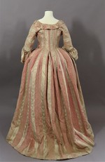 Diese Robe à la française ist mit solchen Compères aus dem Stoff des Kleides, einer rosa und weiß gestreiften Seide mit einem kleinen Blütendekor gefertigt. Sie wurden mit Haken und Ösen geschlossen.